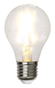 Klar filament LED-Normallampa med E27-sockel från star trading . Färgtemperaturen är varmvit på 2700K och på 470 lumen. Lampan är också dimmerkompatibel. Den här ljuskällan har vita filament istället för gula vilket gör att den syns mindre när den är släckt.