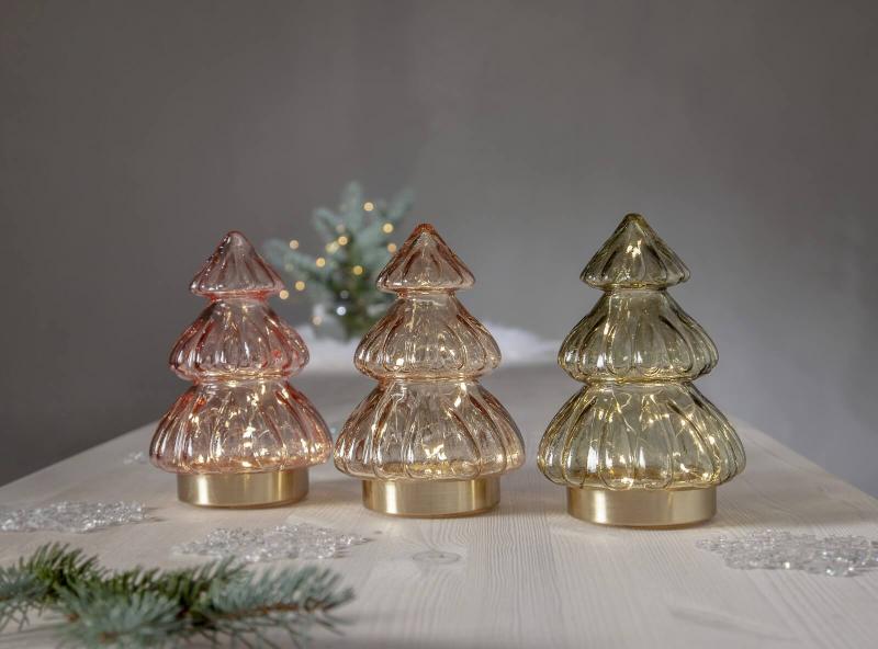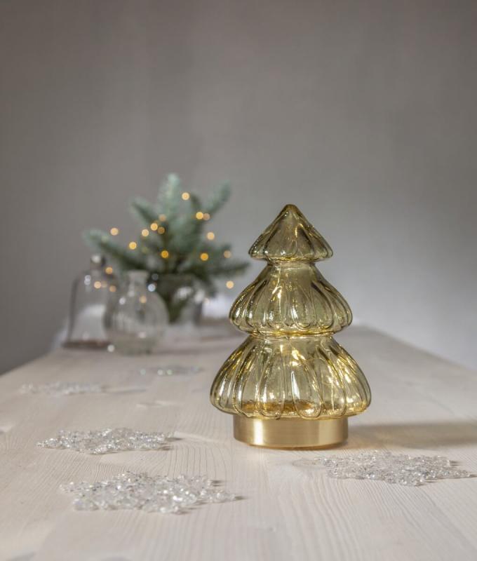 Så vacker bordsdekoration i form av en gran i transparent svagt grönfärgat glas. Guldfärgad bas som diskret gömmer batteriboxen. Abete drivs av 3 st AAA batterier och har självklart en inbyggd timerfunktion så att du lätt kan ställa in när du vill att den ska lysa. Perfekt som dekoration på det dukade julbordet. Batterier köpes separat.