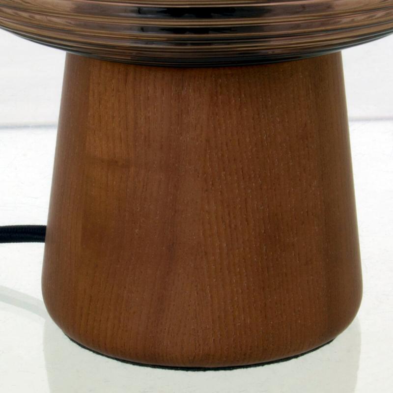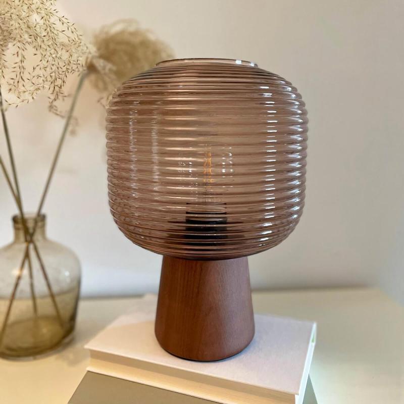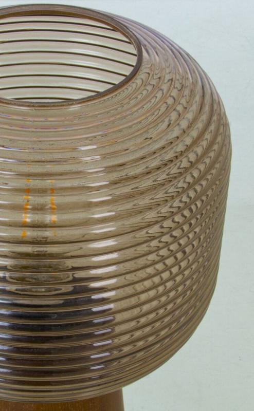 Lys upp ditt liv med Aura, den coolaste bordslampan i stan! Med sin moderna design och blockformade träfot, kommer den att matcha din stil perfekt. Den räfflade skärmen i brunt glas skapar en härligt mysig atmosfär i ditt hem och dämpar ljuset på ett sätt som får alla andra lampor att blekna i jämförelse. Så varför inte lysa upp ditt hem med Aura och se hur den förvandlar ditt rum till en plats där du vill spendera all din tid.