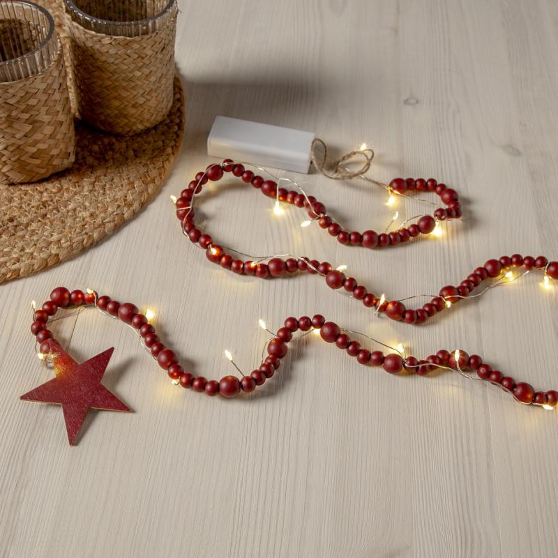 Batteridriven dew drop ljusslinga från Star Trading med små söta röda träpärlor. Slingan har 30 LED-ljuskällor med ett härligt varmvitt sken. Kan användas vid diverse dekorationer, vid tex dukningar, blomsterarrangemang, i fönster, på väggen osv. Timerfunktionen gör det enkelt att ställa in när slingan ska lysa. Beady finns även i brunt och grått.
