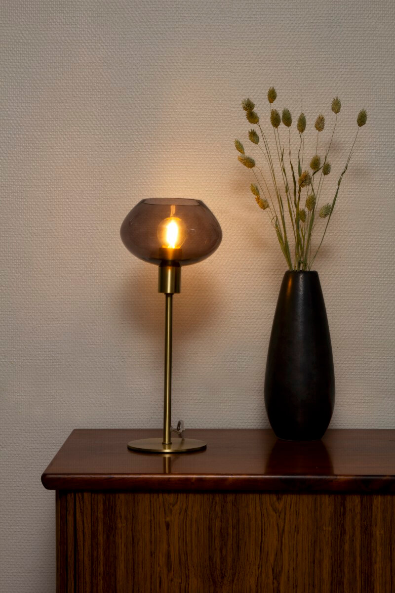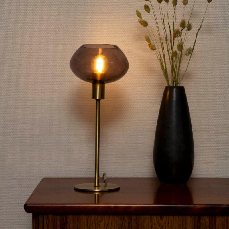 Säg hej till Bell, den glittrande bordslampan som får dig att tända till! Med en lampfot i matt mässing och en rökfärgad glasskärm kommer denna lampa att ge ditt rum den extra touchen av elegans som det behöver. Sätt i en glödlampa på högst 30W E14 (ingår ej), och låt Bell lysa upp ditt liv! Med en sladd utrustad med en mellanströmbrytare och stickpropp, kan du enkelt slå på och av lampan efter behov.
