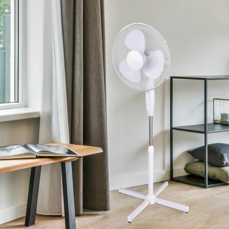Klassisk vit golvfläkt med 3 hastigheter, oscillerande funktion av huvudet för att täcka en bredare yta. En tidlös favorit för behagliga sommardagar. [Läs mer]