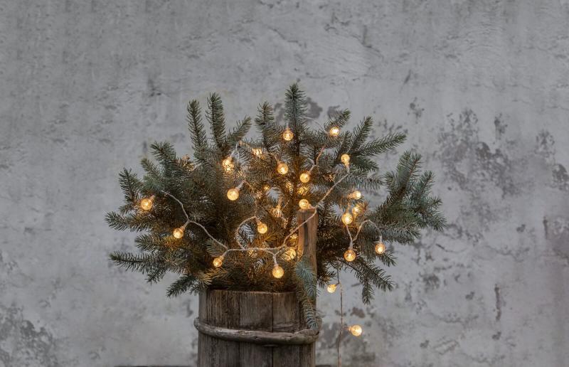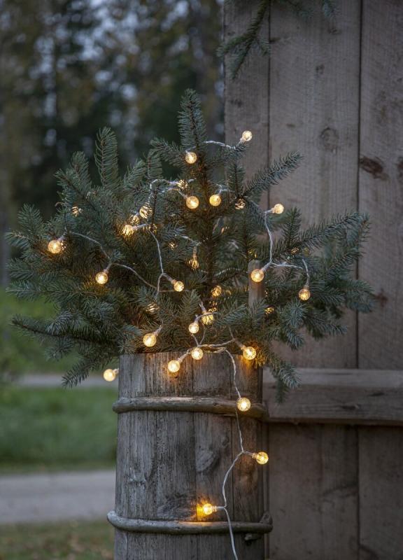 Ljusslinga med 50 härligt varmvita små berrysar med klarglas med bubblor i som ger en härlig effekt. Perfekt att pynta balkongen eller dukningen med. Slingan är 5 meter lång med 5 meter lång transparent anslutningskabel.