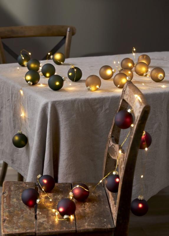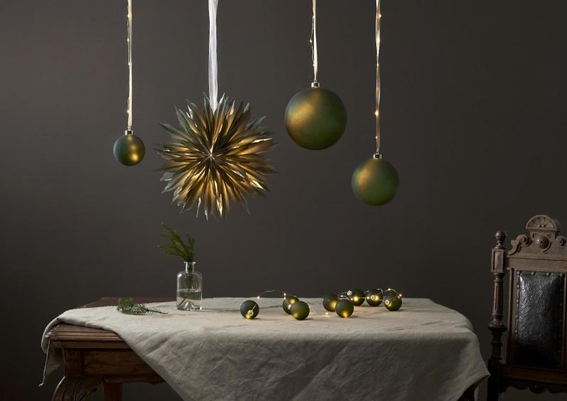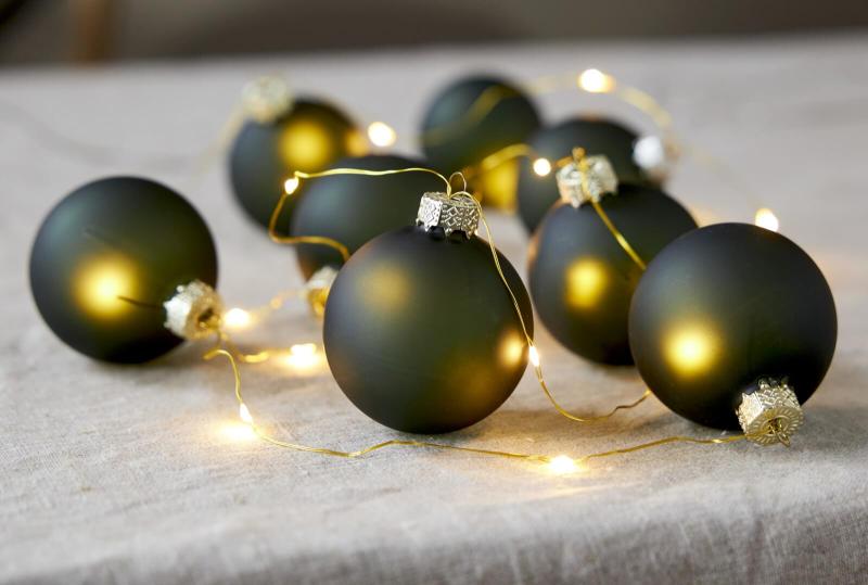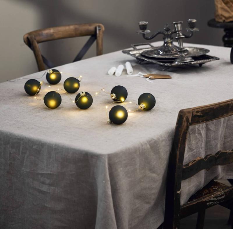 Vacker batteridriven ljusslinga med 8 st mörkt mattgröna glaskulor från star trading. Den mässingsfärgade slingan lyser inte bara i kulorna utan även på slingan där emellan. Perfekt som bordsdekoration eller att hänga i den lilla bordsgranen. Slingan har självklart en timer så du enkelt själv kan ställa in när du vill att den ska lysa.