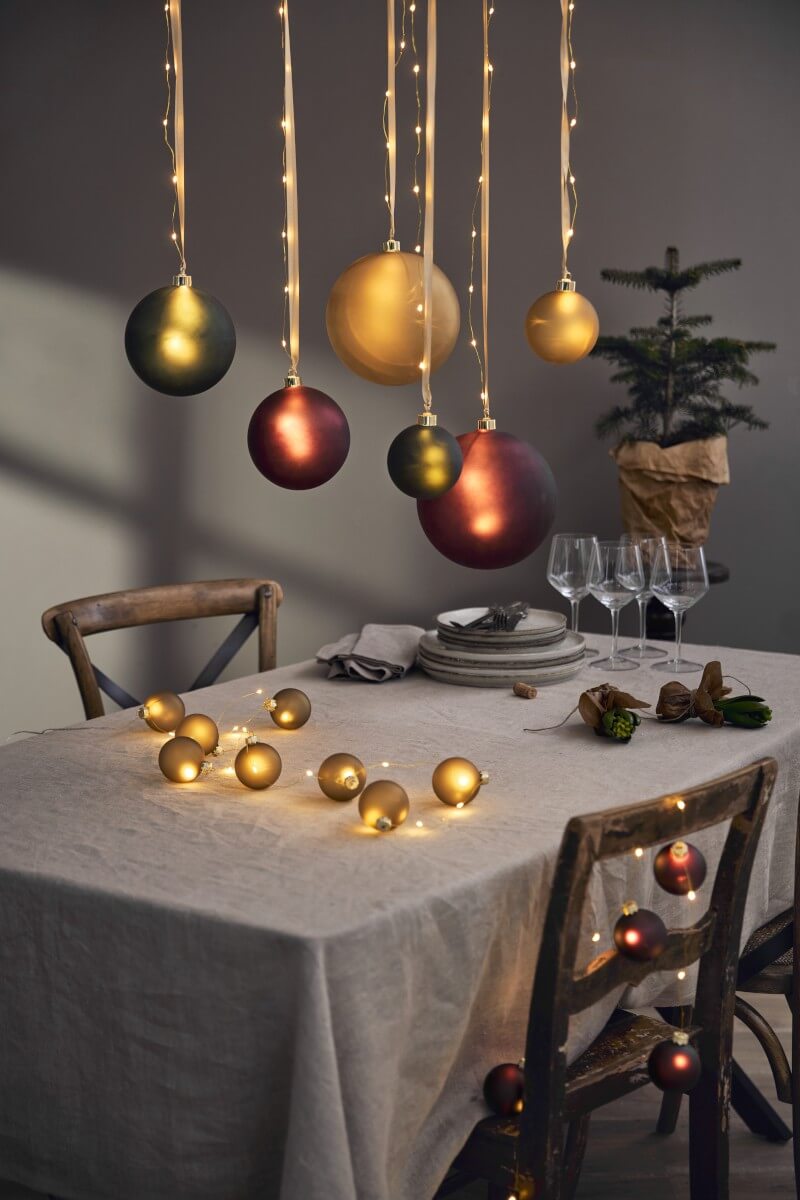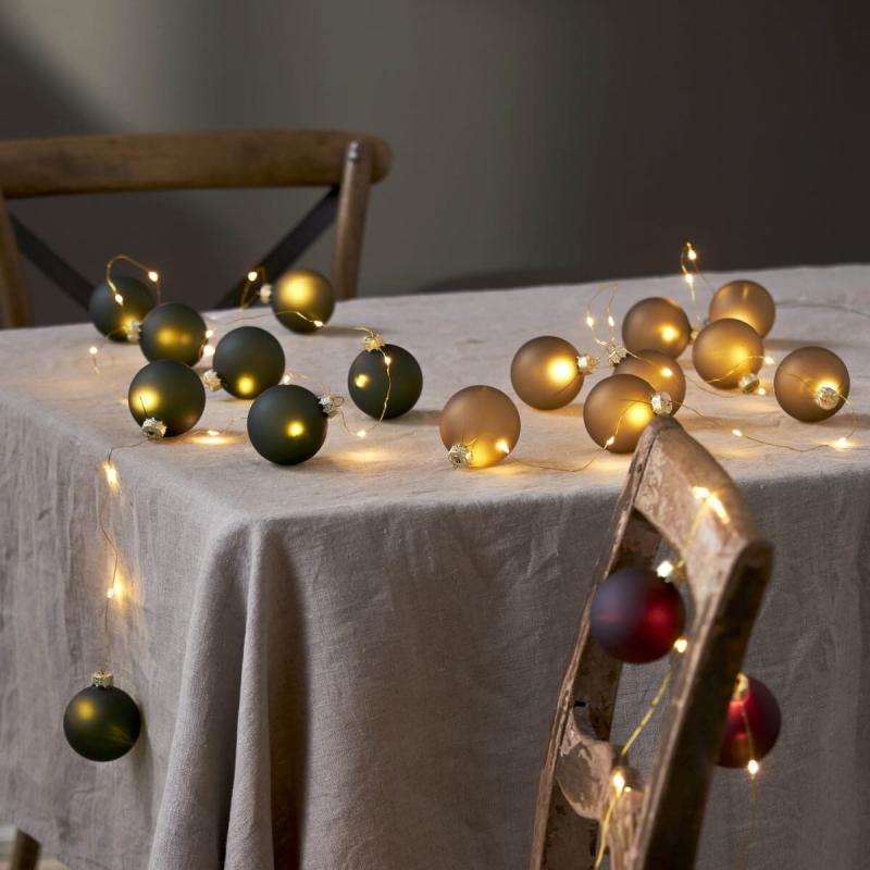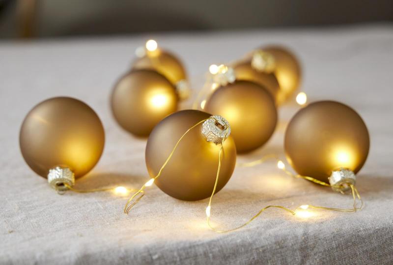 Vacker batteridriven ljusslinga med 8 st mörkt mattguldiga glaskulor från star trading. Den mässingsfärgade slingan lyser inte bara i kulorna utan även på slingan där emellan. Perfekt som bordsdekoration eller att hänga i den lilla bordsgranen. Slingan har självklart en timer så du enkelt själv kan ställa in när du vill att den ska lysa.