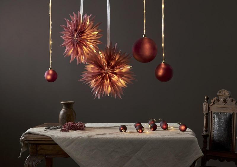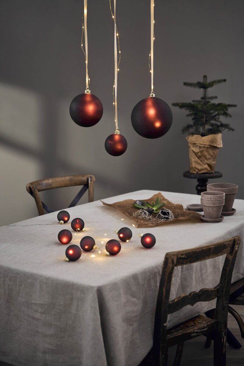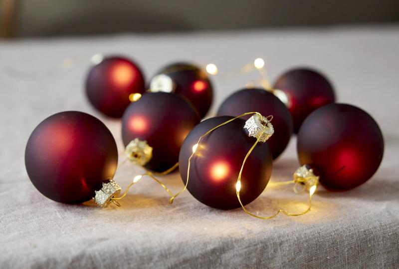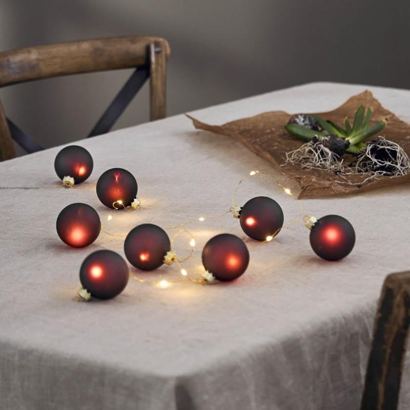 Vacker batteridriven ljusslinga med 8 st mörkt mattröda glaskulor från star trading. Den mässingsfärgade slingan lyser inte bara i kulorna utan även på slingan där emellan. Perfekt som bordsdekoration eller att hänga i den lilla bordsgranen. Slingan har självklart en timer så du enkelt själv kan ställa in när du vill att den ska lysa.