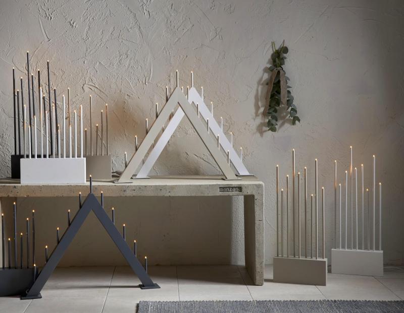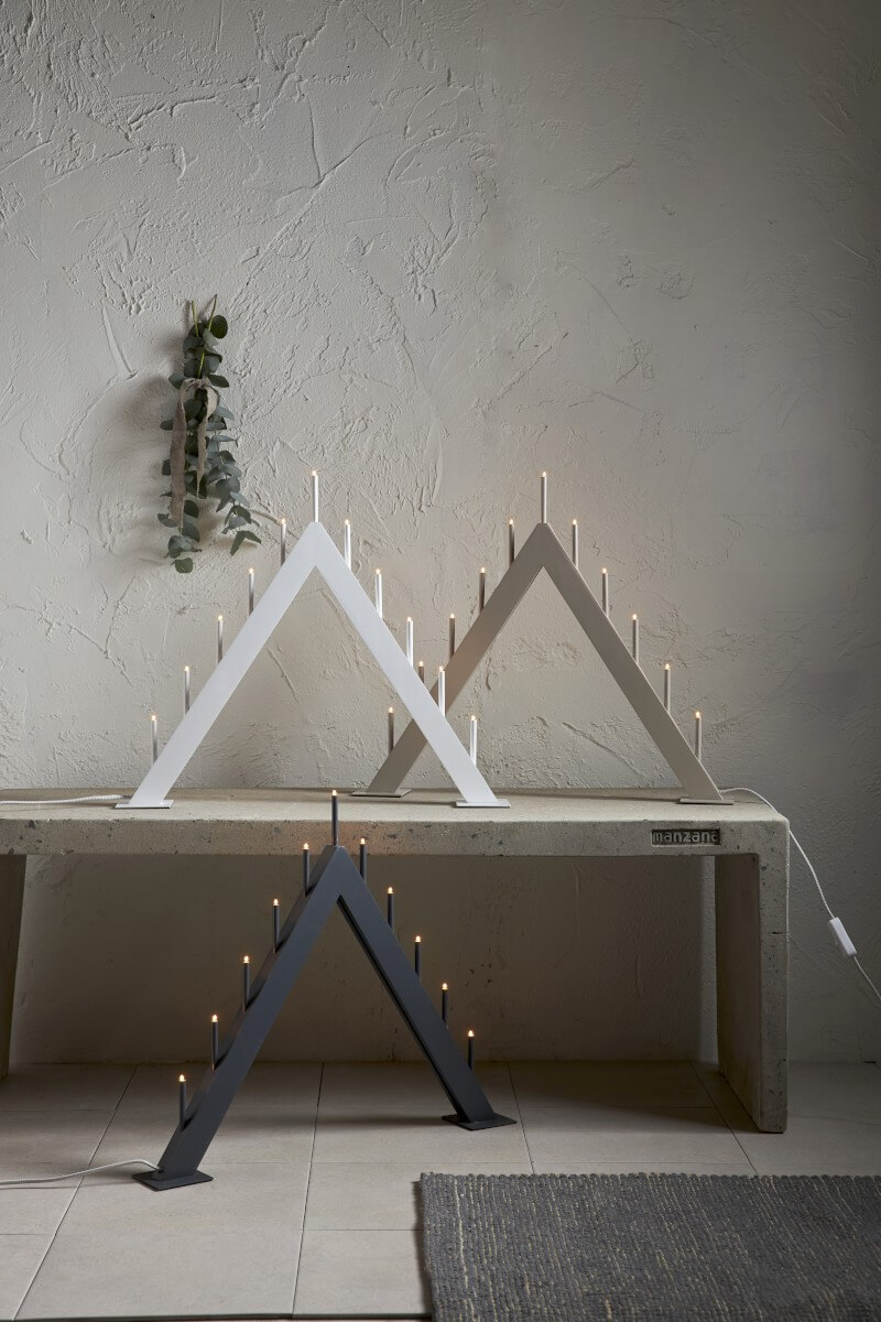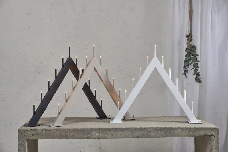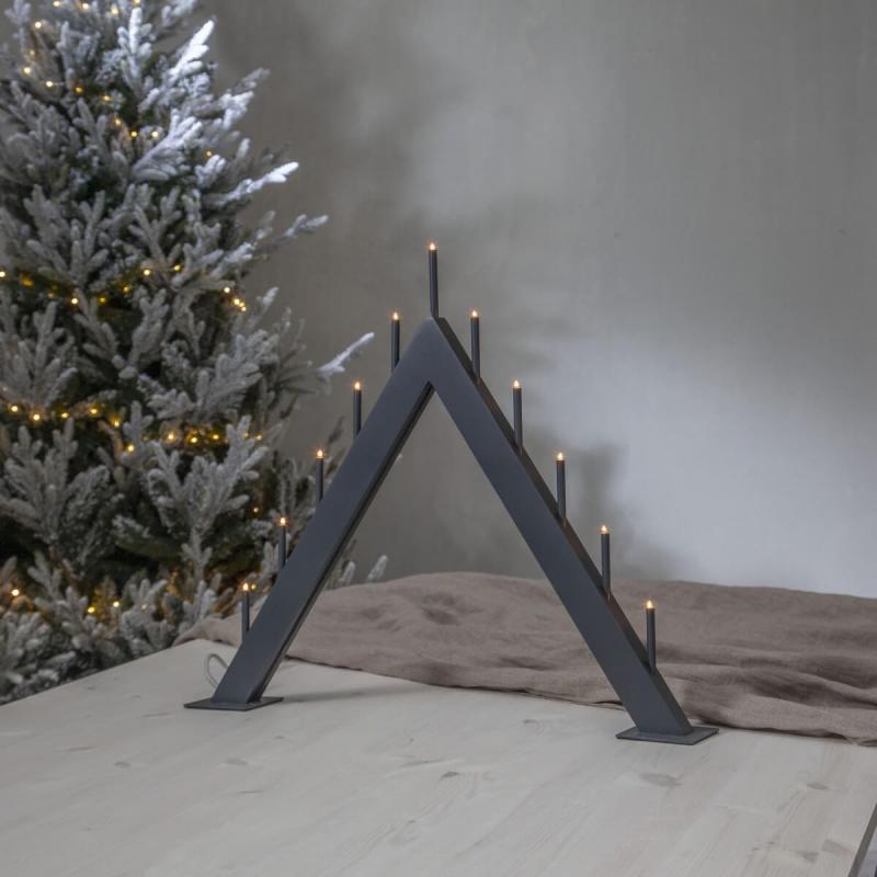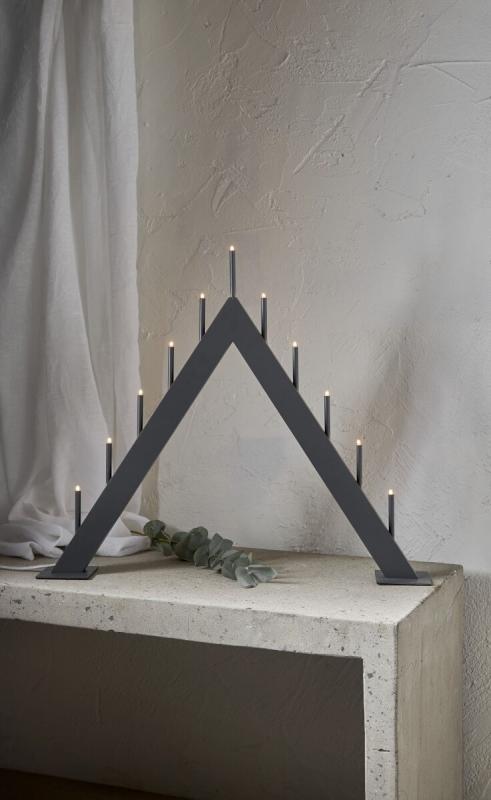 Stilren adventsljusstake med klassisk form i ny design, tillverkad i trä med ljuspipor av tunna metallrör. 11 stycken ljuskällor av modellen E5. Hela ljusstaken är målad i läcker antracitgrå färg. Textilkabel i vitt/grå. Ger ett härligt stämningsfullt ljus året runt..