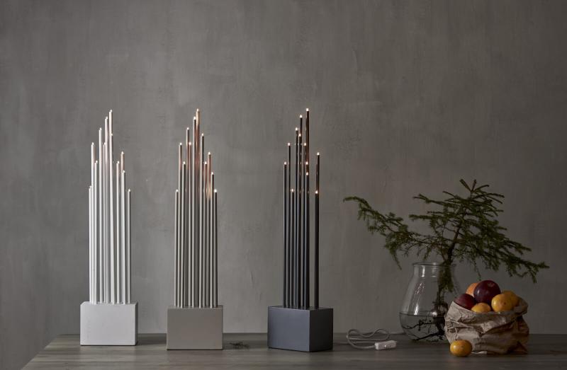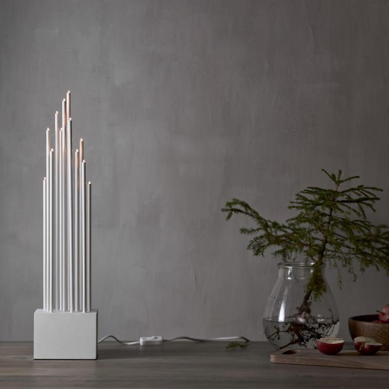 Vi har stor efterfrågan på denna typen av ljusstakar så håll till godo med denna vackra nyheten från Star Trading. Stilren ljusstake på 65 centimeter med kraftig bas i trä, ljuspipor av tunna metallrör. 12 stycken små E5 ljuskällor. Hela ljusstaken i vit färg - enhetligt och snyggt. Textilkabel i vitt/grå adderar lite extra lyx. Ger ett härligt stämningsfullt mysigt ljus hela året runt.