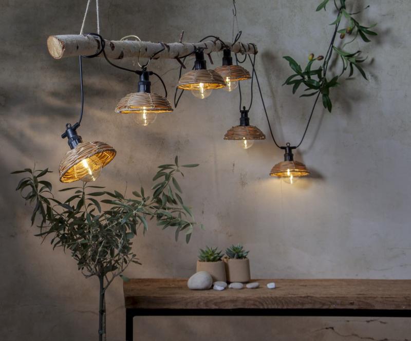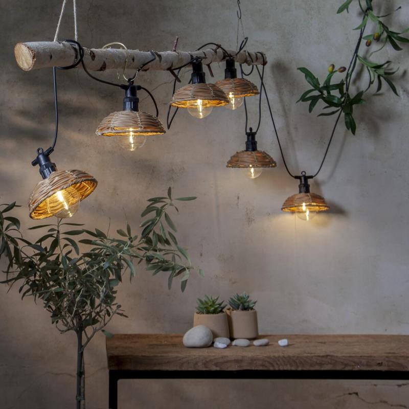 Exklusiv partyslinga med 6 lampor från Star Trading. Varje lampa har en söt liten brun skärm i konstrotting. Förgyll uteplatsen eller trädgården med denna stiliga slinga som ger ett härligt sken. Svart kabel med 70cm mellan lamporna och 5 meter från sista lampan till kontakten.