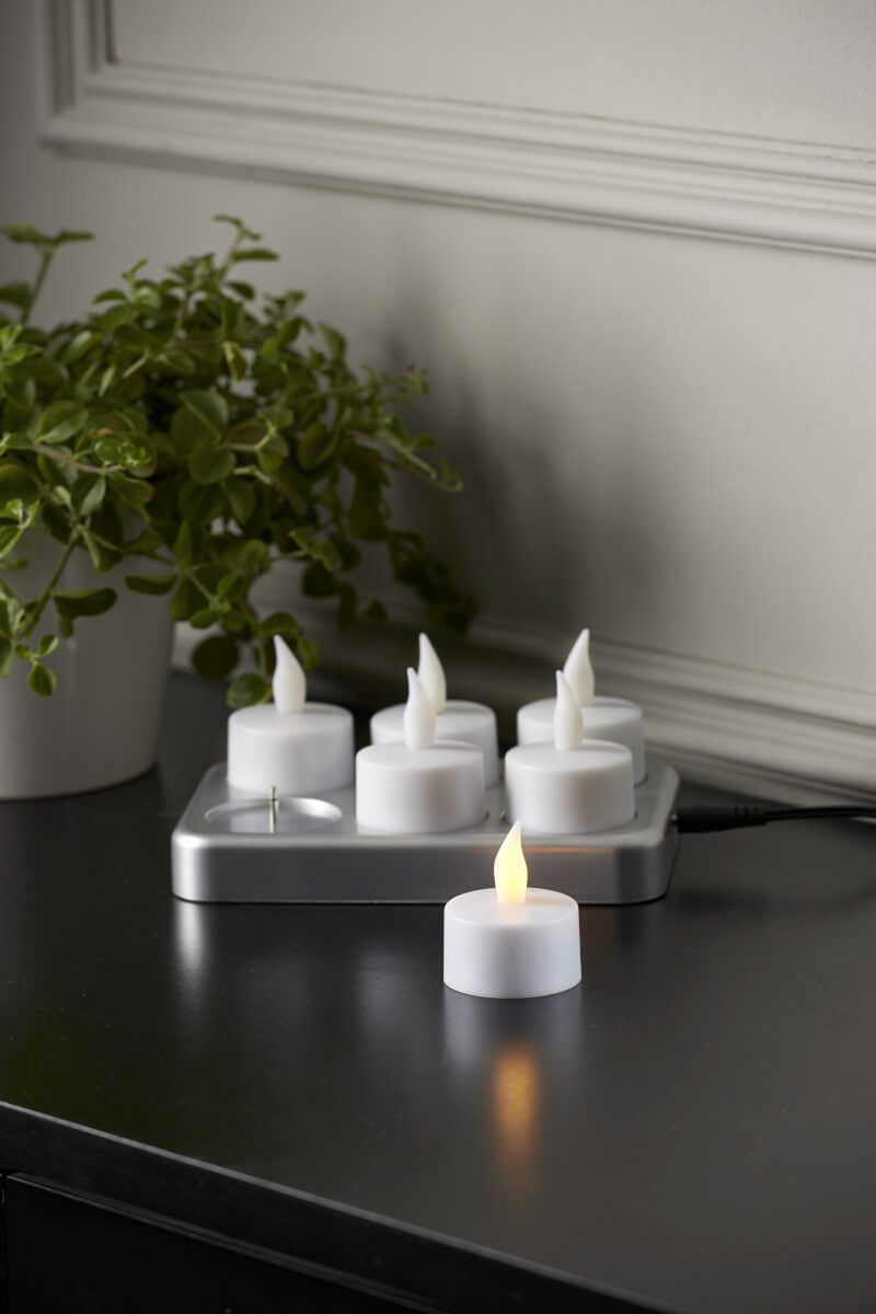 6-pack med uppladdningsbara värmeljus så smart!! Alla ljusen är vita och 5cm höga. Den tillhörande laddningsplattan kopplas enkelt in i ett vägguttag med den 180cm långa sladden. När du känner för att ladda ljusen så bara ställer du dem på plattan så laddas de upp till full effekt igen. Toppen!