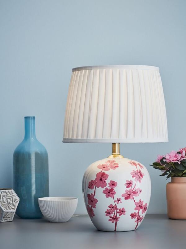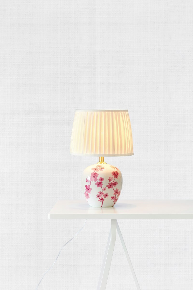 Komplett bordlampa från Markslöjd i Keramik med vackert rosa blommönster med lamphållare i mässing och en vackert veckad skärm.