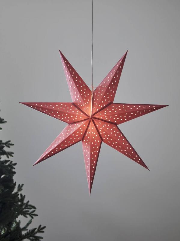 Äntligen är den här! Underbara Clara pappersstjärna med sammetsutsida. Så läcker stjärna som finns i 5 härliga färger. Här ser du Clara i en härlig babyrosa hängande stjärna på 75 centimeter, givetvis ingår 3,5 meter kabel med brytare.