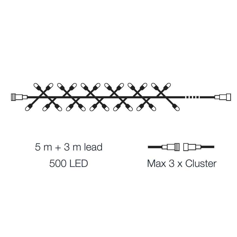 Vid seriekoppling: Förläng med max tre stycken Cluster 5m i följd. Då får du sammanlagt 15 meter ljusslinga.