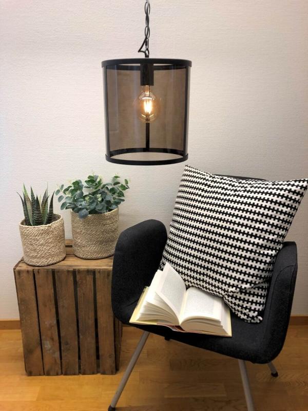 Dante taklampa från Oriva. Vacker Taklampa med stomme i svartlackad metall omgiven av ett härligt rökfärgat glas som släpper igenom ljuset sådär härligt mjukt. Kombinera med en snygg dekorationsled för bästa effekt. Här ser du lilla Dante med en ljuskälla 28 cm bred.