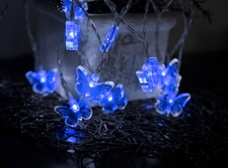 Ljusslinga som drivs med batteri den har 15 blå LED-lampor och fjärilar i akryl. Fin ljusslinga att dekorera med till vardags och fest. Den inbyggda timern gör det lätt att ställa in när ljusslingan ska lysa.