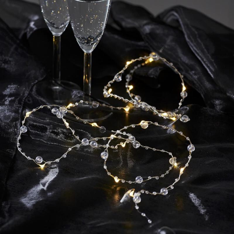 Liten nätt batteridriven led ljusslinga med massa små söta transparanta pärlor, 20 stycken ljuspunkter av dewdrops. Kan användas vid diverse dekorationer, vid tex dukningar, blomsterarrangemang, i fönster, på väggen osv. Den inbyggda timern gör det lätt att ställa in när produkten ska lysa.