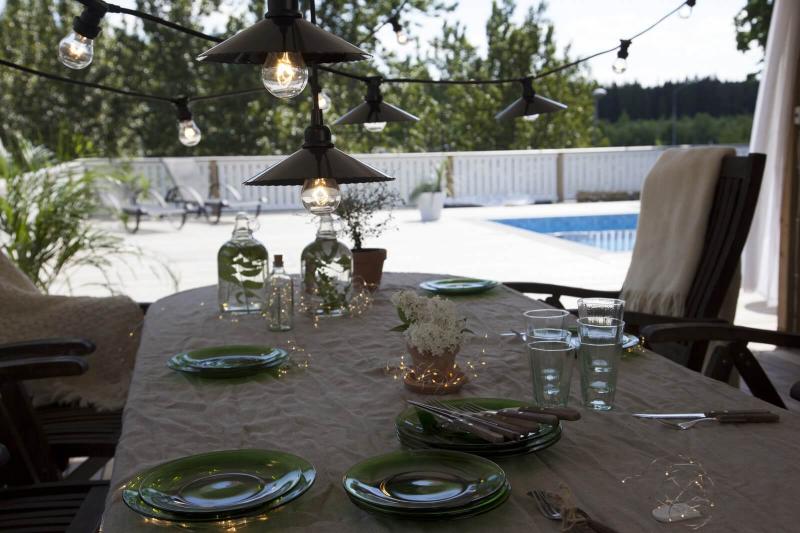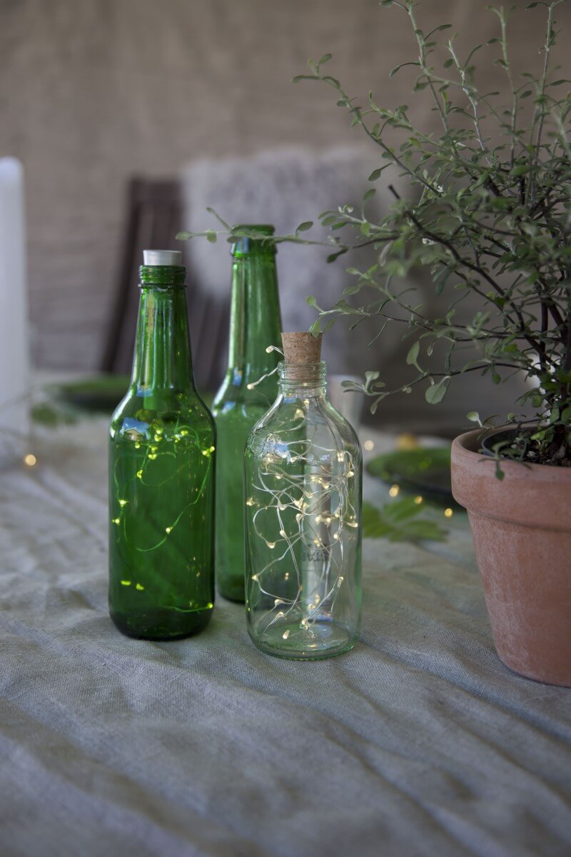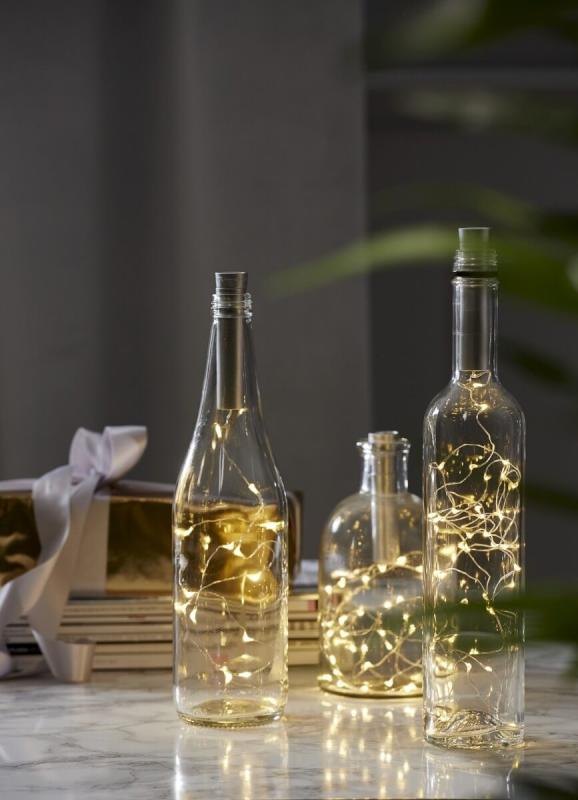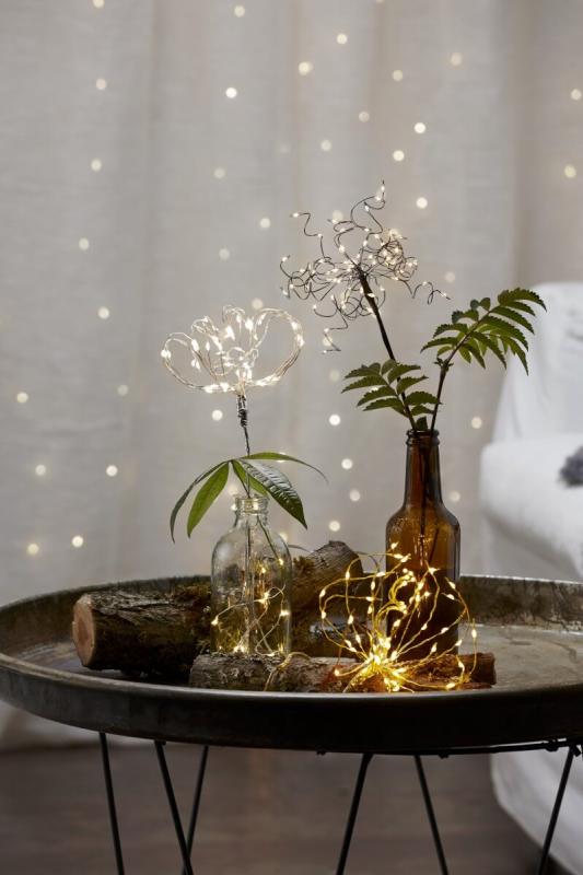 Batteridriven ljusslinga i silverfärg med dew drops. Slingan har 15 stycken varmvita LED-ljuspunkter med ett härligt varmvitt sken. Kan användas vid diverse dekorationer, vid tex dukningar, blomsterarrangemang, i fönster osv. Batteriboxen är formad som en tub för att passa i tex glasflaskor.