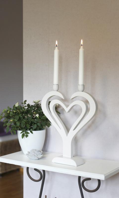 Fin träljusstake i form av stort hjärta. Ljusstaken är i färgen vit och har plats för två stearinljus. Placeras fint på ett bord för att skapa en härlig julstämning i hemmet.