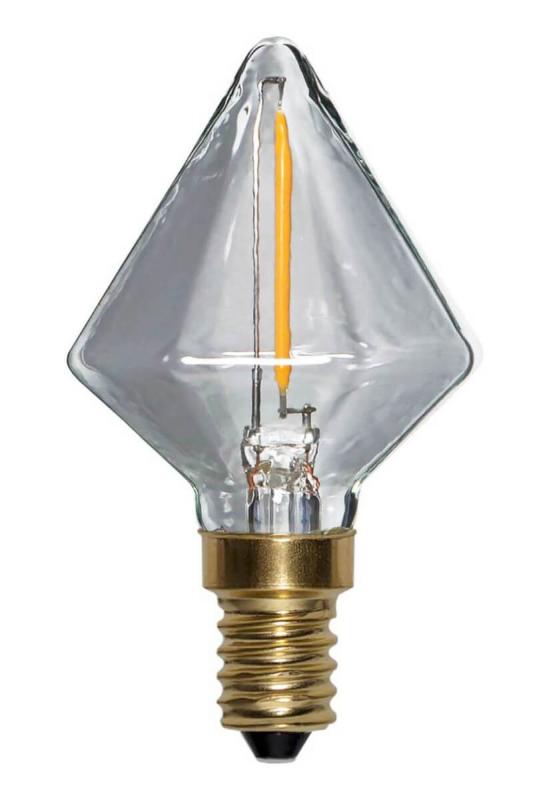 Decoration LED-lampa med varmt och mjukt sken. Färgtemperaturen är 2200K med ett ljusflöde på 45 lumen och glaset har formen av en liten diamant. Lampan har E14-sockel och är dimmerkompatibel.