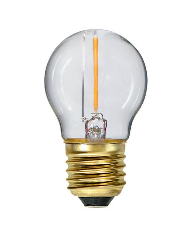 Decoration LED-lampa med varmt och mjukt sken. Färgtemperaturen är på 2100K med ett ljusflöde på 70 lumen och den har E27-sockel.
