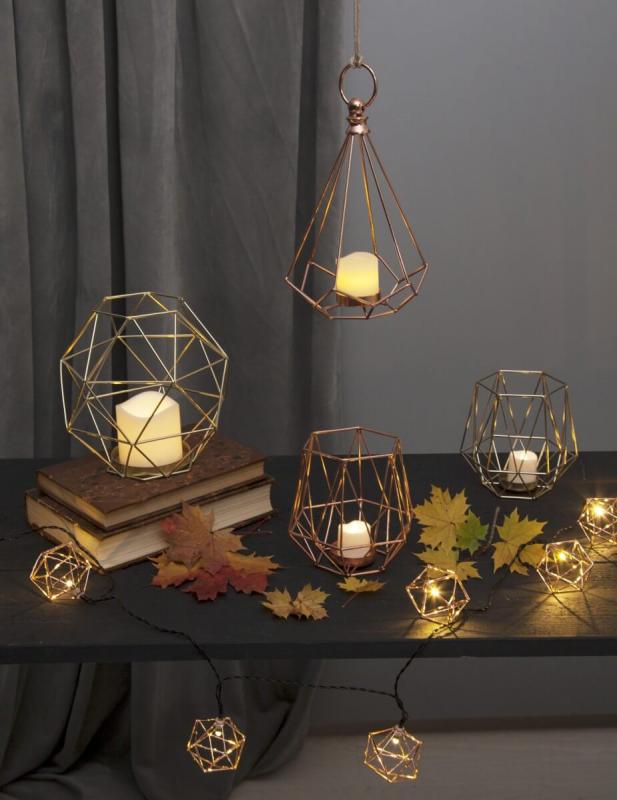 Elegant lykta i koppar från Star Trading med en höjd på 20cm. Placeras fint på ett bord eller i en hylla som en del av en modern och snygg inredning. Lyktan är batteridriven och den inbyggda timern gör det lätt att ställa in när lyktan ska lysa.