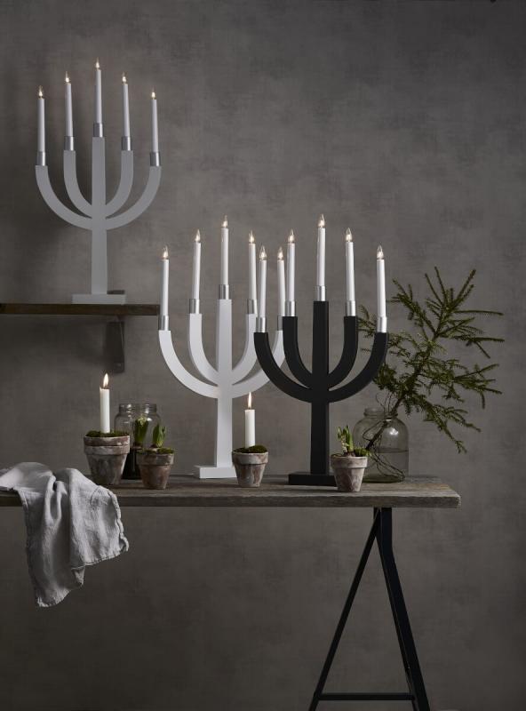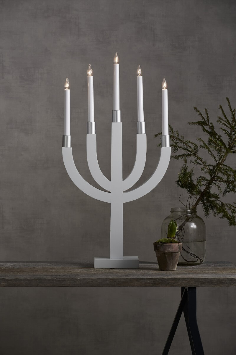 Stilren vit träljusstake med ljusmanschetter i silver och enkla former. Elias ger snabbt en härlig julstämning i ditt hem. Finns även i fler färger.