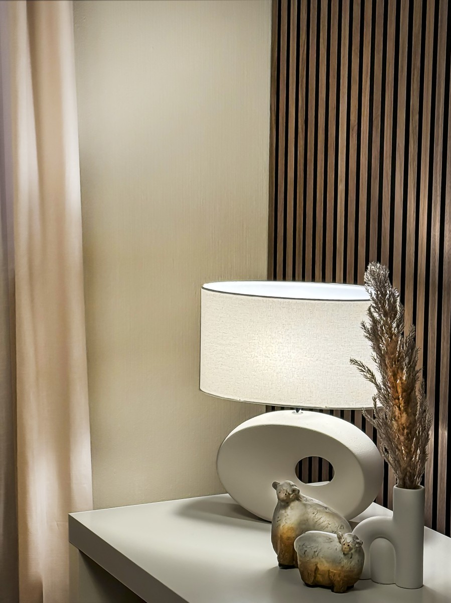 Vacker och stilren bordlampa från Aneta med stomme i Beige keramik perfekt kombinerat med en oval naturvit skärm i bomull. Ellipse är en mångsidig bordslampa som kan placeras på sängbordet, skrivbordet eller i fönstret för att skapa en varm och inbjudande atmosfär i rummet.
