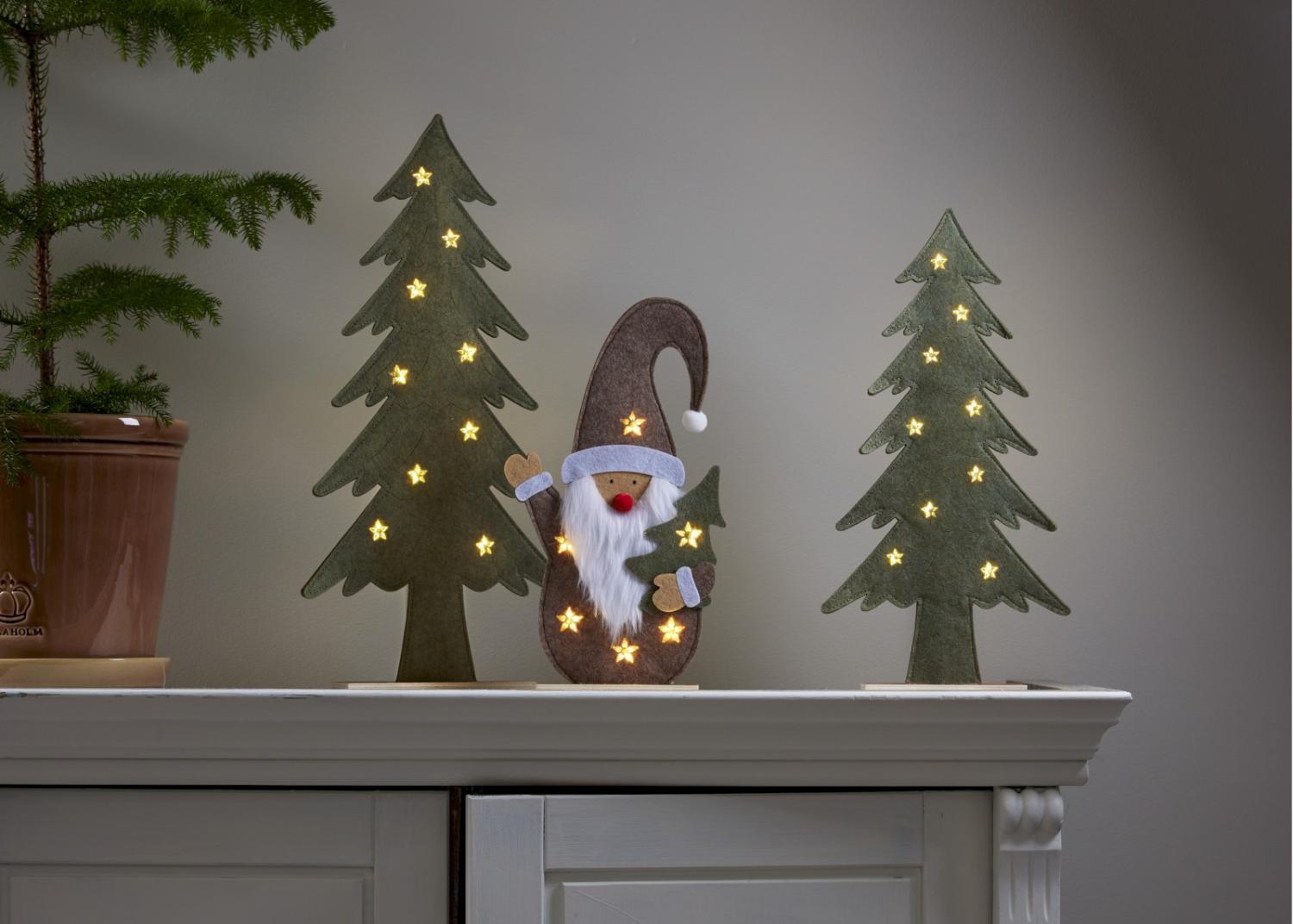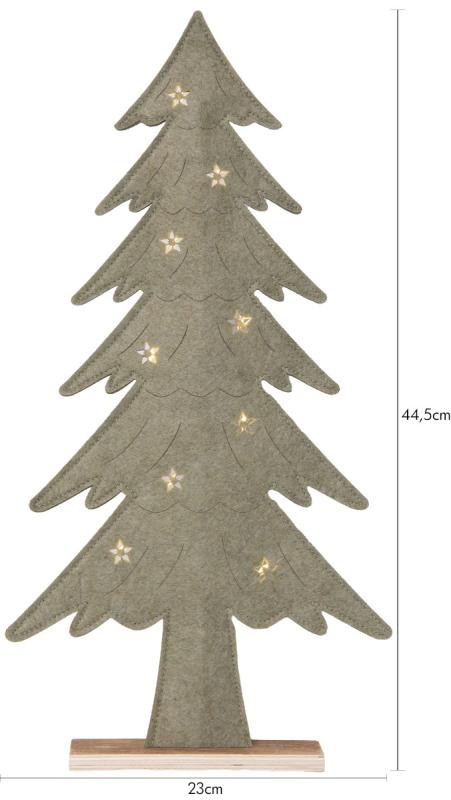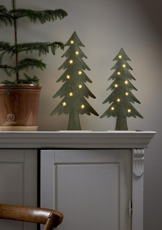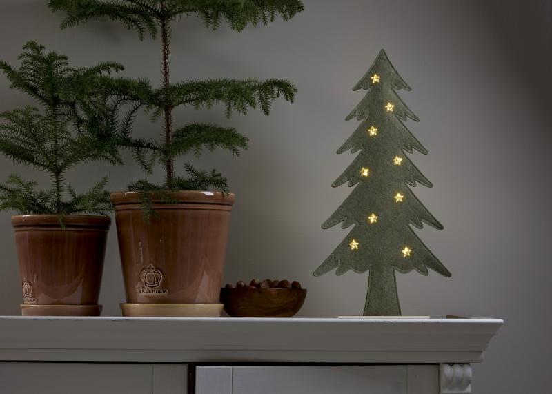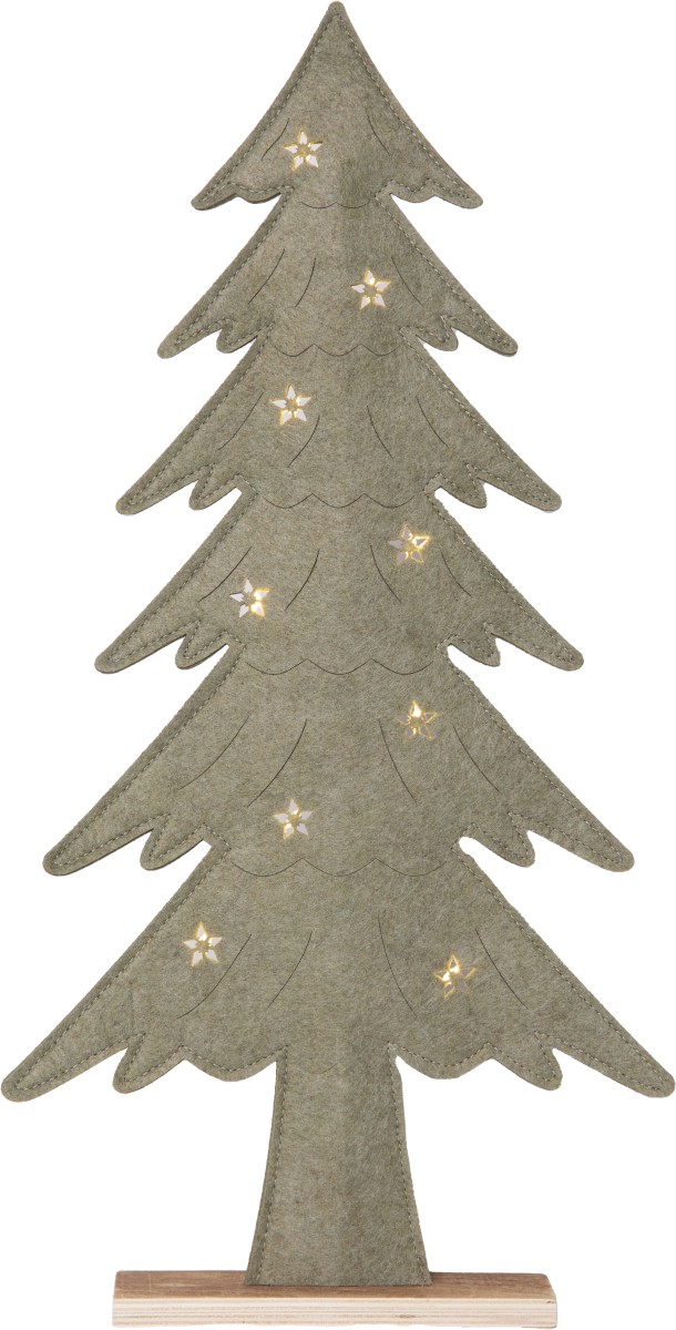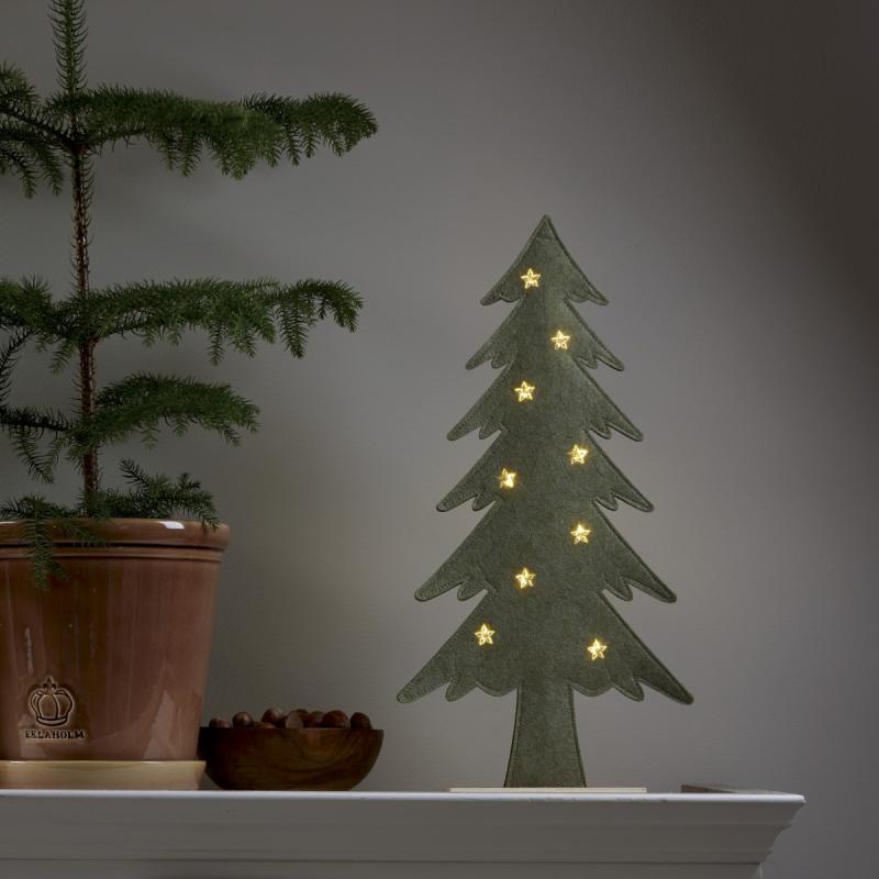 Mysig juldekoration från Star Trading i form av en gran gjord i filtmaterial. Små LED punkter lyser fint i det utskurna stjärnmönstret. Basen är gjord i trä. Fin dekoration som är lättplacerad, lyser fint och skapar julstämning. Drivs av batteri och har timer.