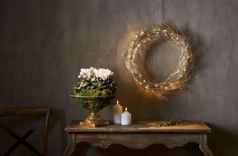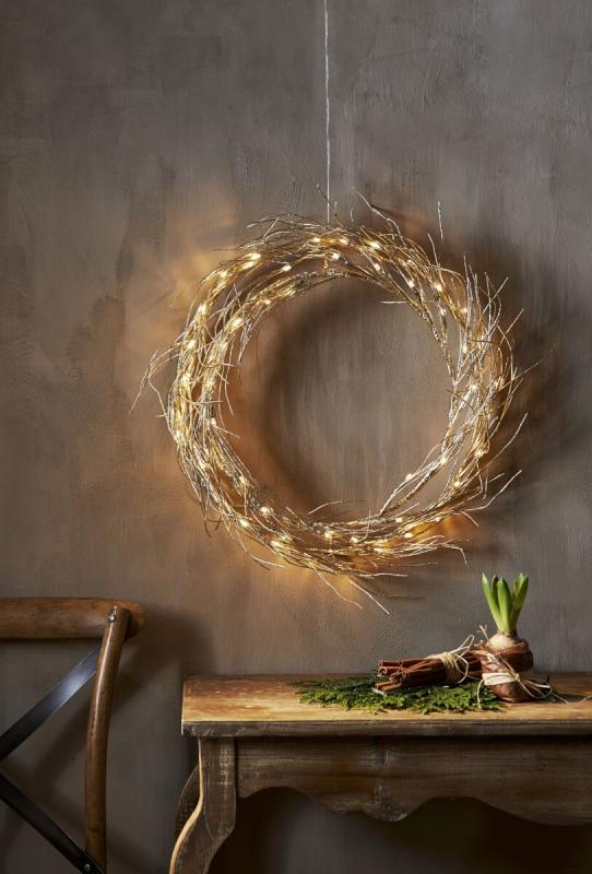 Wow wow wow….fantastiskt vacker krans i svag guldton med dubbla lager som gör den extra fyllig. Jämt fördelat över kransen sitter 50 stycken små små varmvita ljuspunkter för att lysa upp ditt hem både till vardags och till fest.