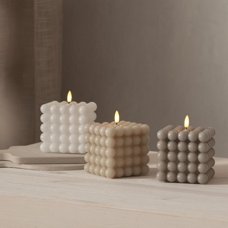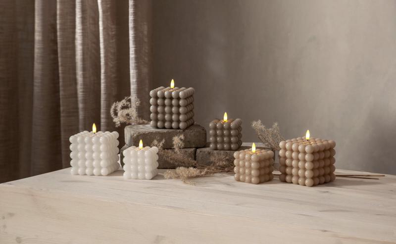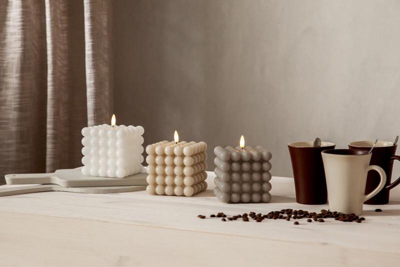 Flamme Dot är en ny serie batteridrivna ljus från Star Trading. Här ser du Dot som ett fyrkantigt ljus gjord av grått vax med en bubblig yta. Ljuset är cirka 10x12,5cm inklusive lågan. Detta batteridrivna ljus blir en vacker dekoration, både ensam och i grupp ihop med övriga ljus. Självklart har Dot timerfunktion och när brytaren är på timerläget lyser ljuset i ca 25 dagar med en vacker realistisk låga i varmvitt. Den drivs av 2 AAA batterier, dessa ingår ej.