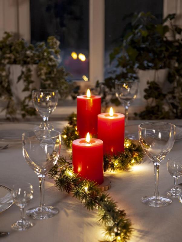 Flamme Flow är ett rött batteridrivet blockljus med den naturtrogna Flamme lågan. Detta stearinljus har en blank nedsänkning precis under lågan, detta gör att ytan ser ut som flytande vax vilket gör ljuset än mer naturtroget. Ljuset är cirka 7,5cm i diameter och höjden 15 cm för vax delen och cirka 17 cm totalhöjd inklusive lågan. Detta ledljus blir en vacker dekoration, både ensam och i grupp ihop med övriga ljus gärna från Star Tradings Flamme serie. Den har timerfunktion och när brytaren är på timerläget lyser ljuset i ca 30 dagar med en vacker varmvit och realistisk låga. Den drivs av 3 AAA batterier, batteri ingår ej.