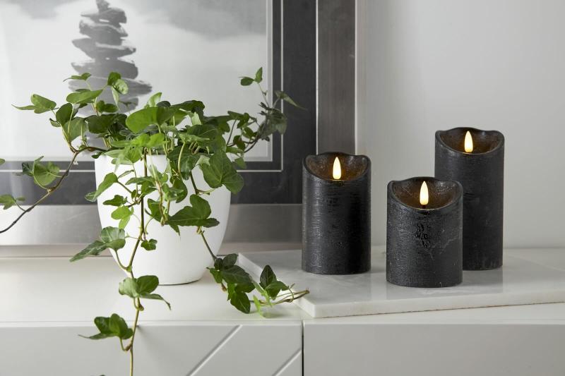 Mycket verklighetstroget vaxljus med den populära Flamme lågan. Rustik är en ny serie ljus med något grövre yta än de andra ljusen. Ljusen finns i flera olika höjder och färger. Självklart har alla ljusen inbyggd timerfunktion. Här ser du Rustic svart 15 centimeter.