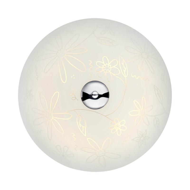 Härlig plafond från Markslöjd med blom mönstrat glas. 12W integrerad dimbar LED gömmer sig bakom kupan. Givetvis med krokupphäng.