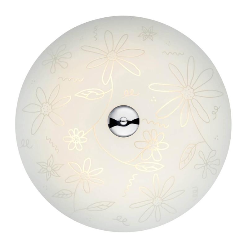 Härlig plafond från Markslöjd med blom mönstrat glas. 15W integrerad dimbar LED gömmer sig bakom kupan. Givetvis med krokupphäng.