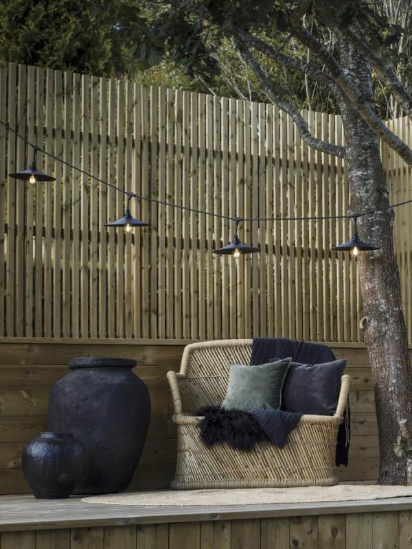 Flex Out ljusslinga för utomhusbruk från PR-Home (IP44) med 5 st E27 lamphållare, Max 15W. Totallängden på slingan är 6,5 meter med 2,5 meter till första lamphållaren, sedan 80 cm mellan varje lamphållare. 15 cm från T-koppling ner till skärmring. Slingan kommer ihop med lampskärmen Lamina i svart pulverlackad metall. Skärmen är 29 cm bred och 8 cm hög.
