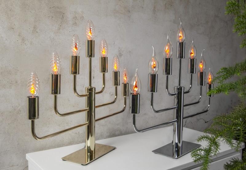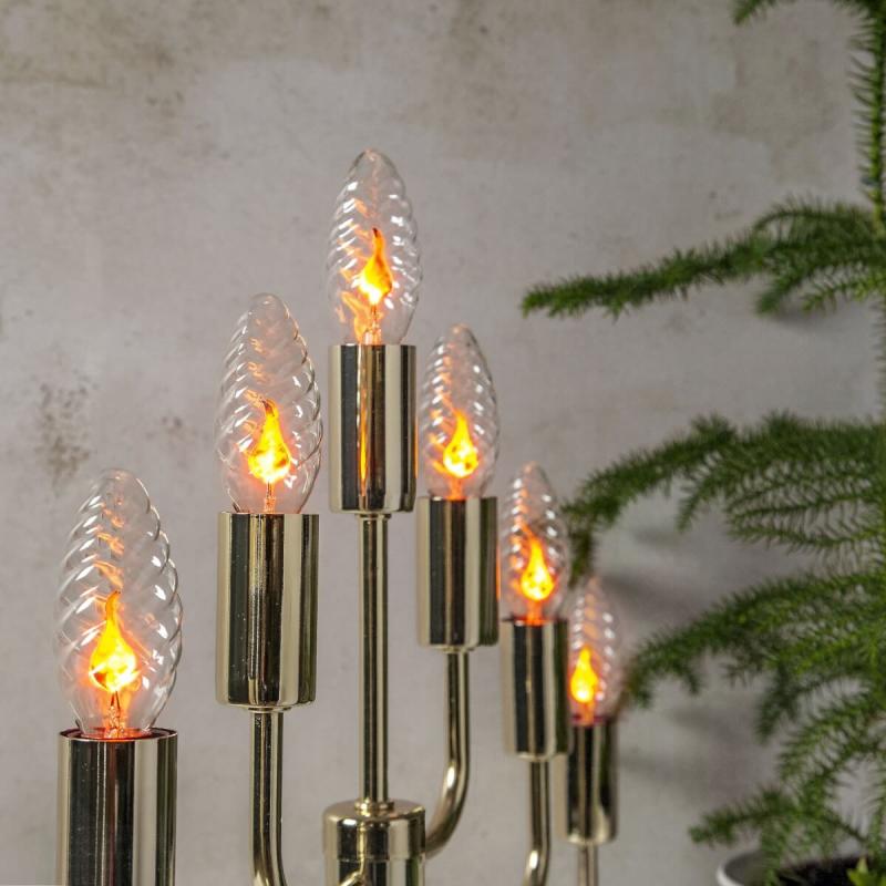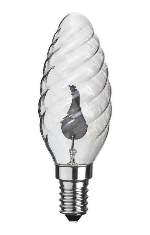 Dekorativ glödlampa där skenet liknar en eldsflamma. Inuti gashöljet sitter en liten låga som flammar. Lampan har E14-sockel och klar, vriden glaskropp.