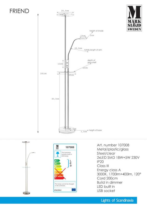 FRIEND Golvlampa 2L 181cm med USB Stål