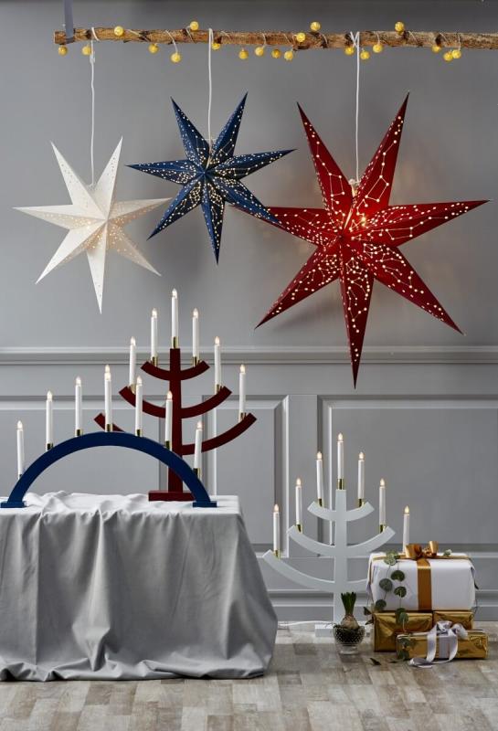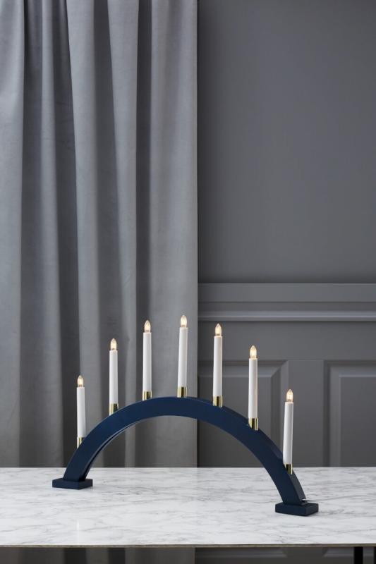 Blå bågformad träljusstake med 7 stycken mässingbelagda ljushållare. Fin adventsljusstake att dekorera med till jul. Ljusstaken har 7 ljuskällor.