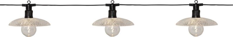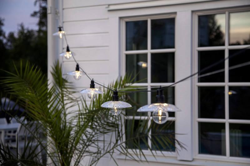 Exklusiv partyslinga med 6 lampor från Star Trading. Varje lampa har en söt liten skärm som ser ut som pressat glas. Förgyll uteplatsen eller trädgården med denna stiliga slinga som ger ett härligt sken. Svart kabel med 70cm mellan lamporna och 5 meter från sista lampan till kontakten.