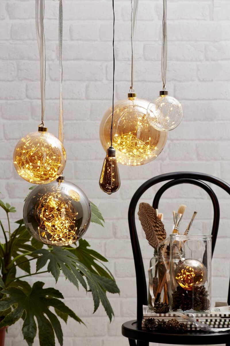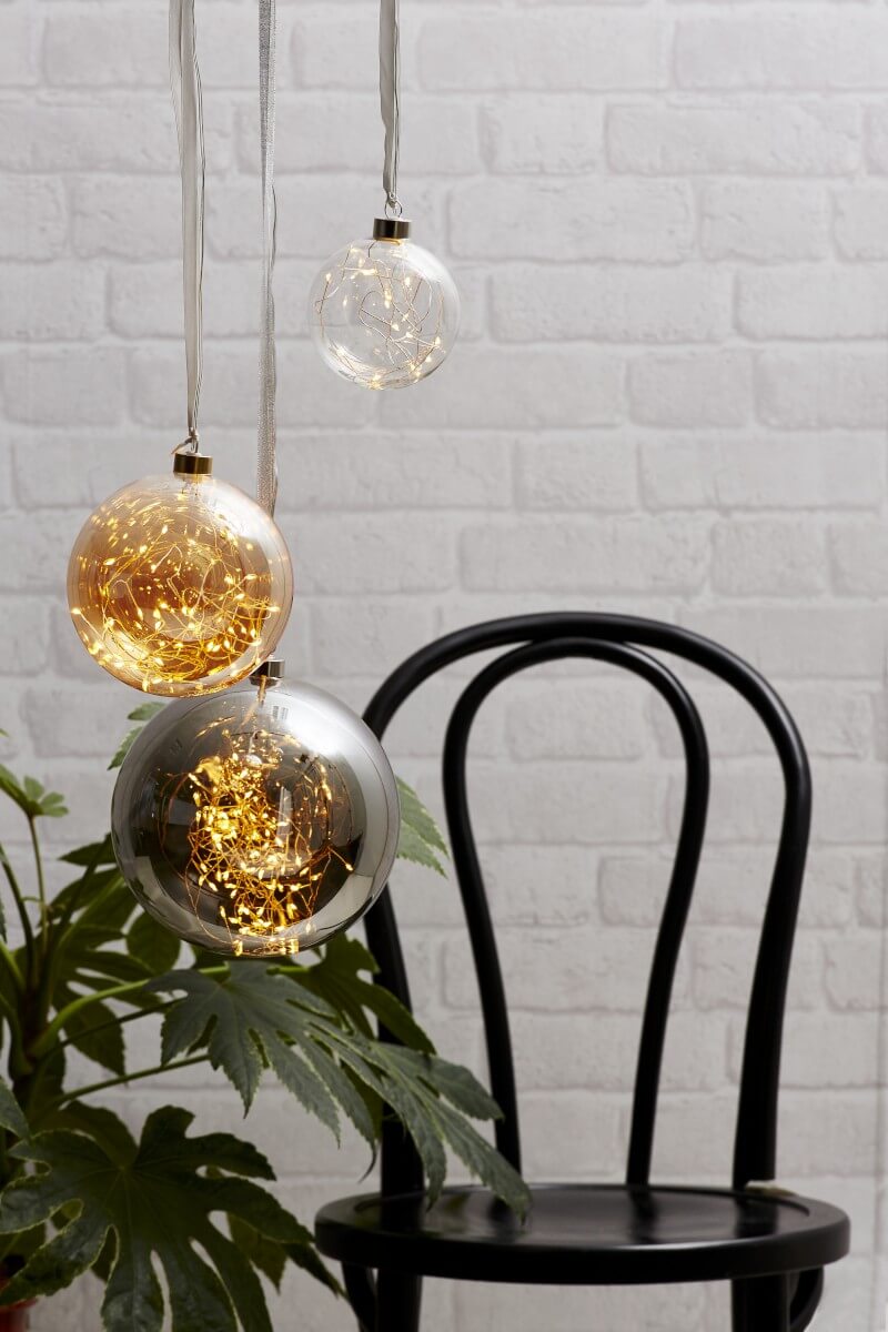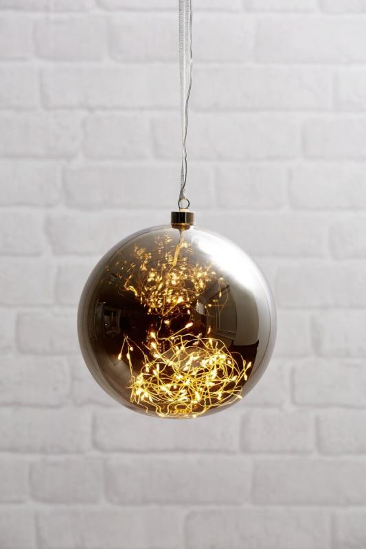 Rökfärgad glaskula med den läckra dew dropslingan inuti. Slingan har 80 små LED ljuskällor. En mycket fin glasdekoration som ger ett vackert sken och kan hängas fritt i hemmets alla rum.