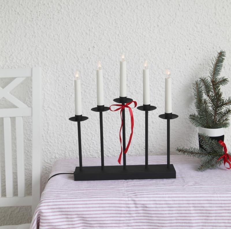 Stilren och Lättplacerad ljusstake i svart. Här med ett litet rött band att dekorera den med.