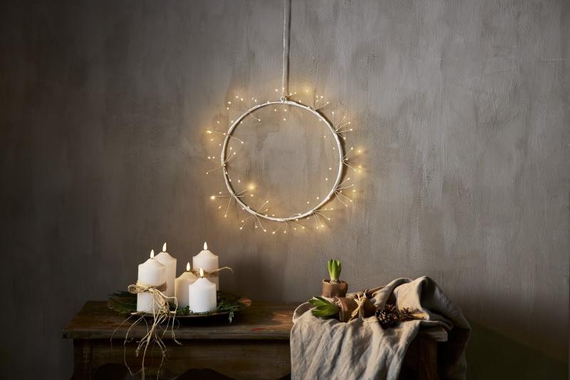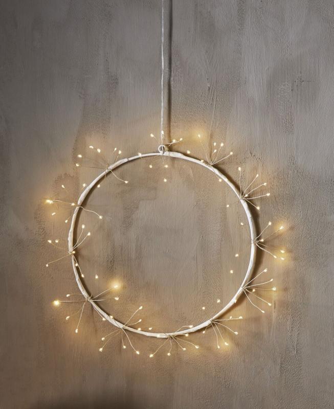 Stilren och vacker men enkel krans att hänga mot en väggen eller i ett fönster. Kransen är vit med hela 108 små led punkter som lyser varmt och stämningsfullt . Dekorera till jul eller vid andra festliga tillfällen.