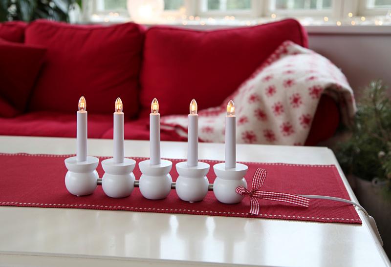 Läcker liten ljusstake som lätt hittar sin plats i ditt hem, Tjusig 5 armad träljusstake med en röd/vit rosett som skapar julstämmning i ditt hem