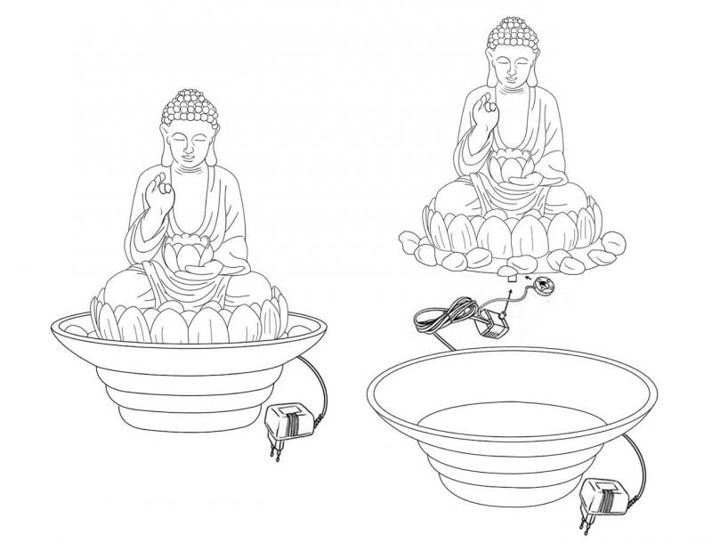 Vattenkonsten är avsedd till att placeras ovanpå den medföljande vattenbehållaren. Pumpen ska placeras i behållaren och därifrån leda vattnet upp till vattenkonsten, från vilken det sedan rinner
