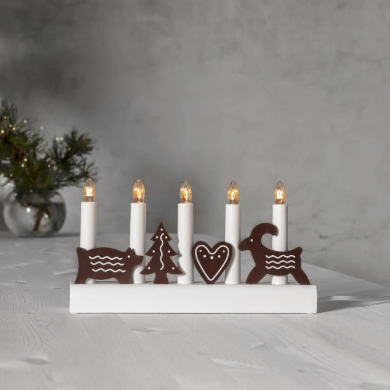 Så söt liten träljusstake som passar i de små fönstren såväl som i de stora här vackert dekorerad med pepparkakshus pepparkaksgranar, 5 ljuskällor skapar härlig julstämning i ditt hem