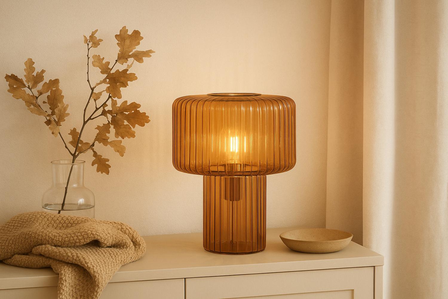 Elegant bordslampa från Cottex med modern glasdesign i tonatt amberfärgat räfflat glas. Ljuset sprids mjukt genom strukturen och skapar en varm, inbjudande atmosfär. Perfekt som stämningsljus i vardagsrum, sovrum eller hall. En stilfull detalj som kombinerar nordisk enkelhet med exklusiv känsla.