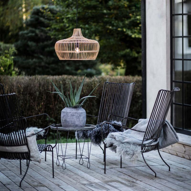 Kisha takskärm i flätad rotting från välkända PR-Home. Skärmen med dess unika form och flätning silar ljuset och skapar ett vackert skuggspel. Eftersom det är ett naturmaterial trivs den bäst under ett tak, i ett inglasat utrymme eller inomhus. Levereras med svart sladd 1,2 m och takkopp.