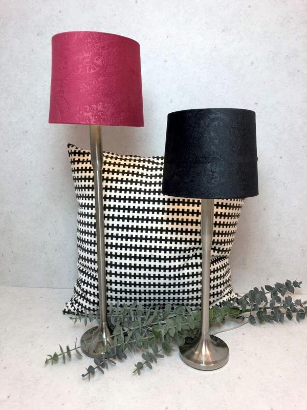Läcker sammetsskärm från Oriva med ett härligt dovt mönster, skärmen finns i flera storlekar och färger. Här ser du Paisley 20 cm i vinröd.