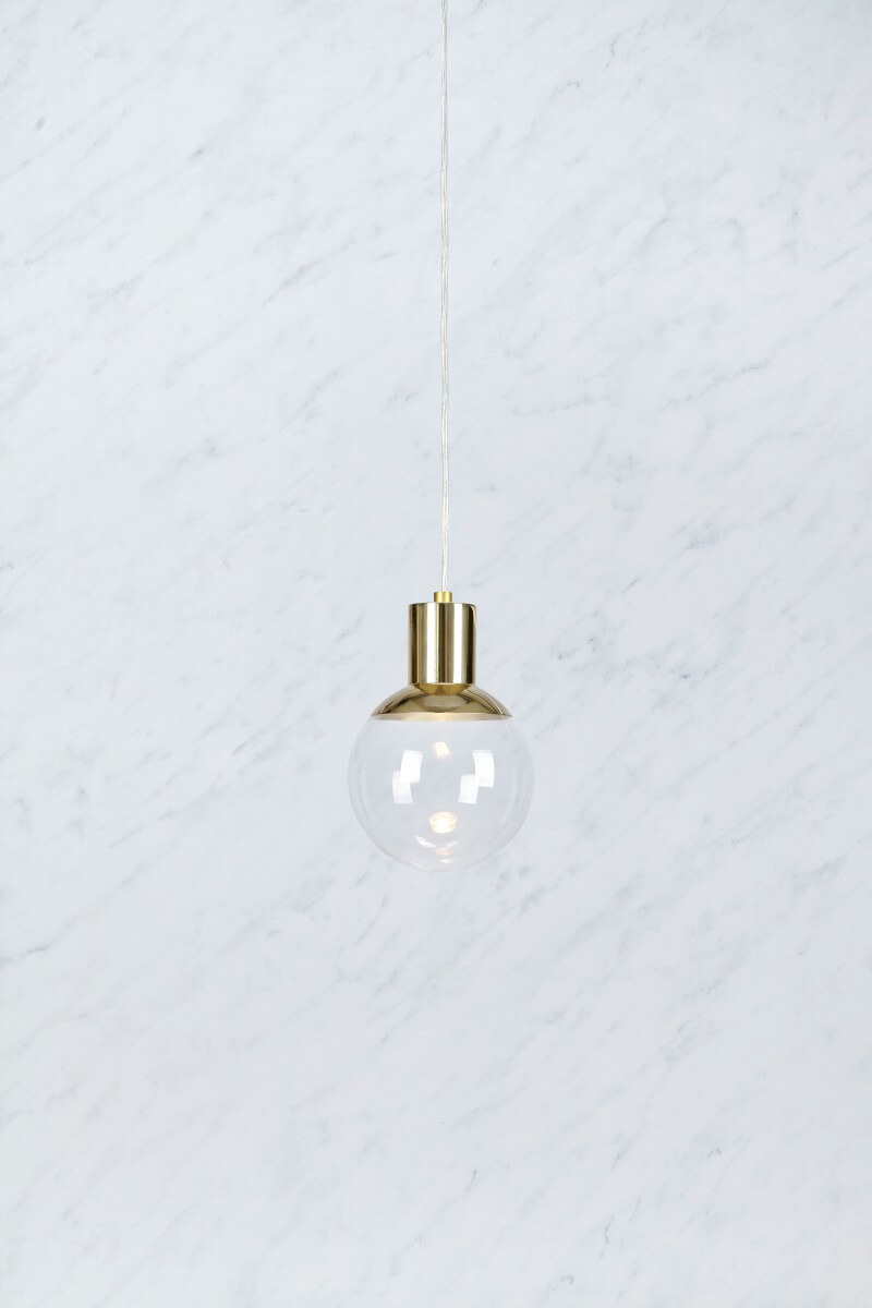 Land taklampa i mässing från Markslöjd. Skärm i glas. Max 6W GU10 ljuskälla. OBS! Fast installation med bygelupphäng. 1,5m transparent sladd