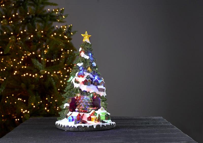 Så härligt detaljrik bordsdekoration med flerfärgade LED ljuspunkter och ett snurrande tåg inuti granen, dekorationen drivs med batteri och har givetvis en inbyggd timer.